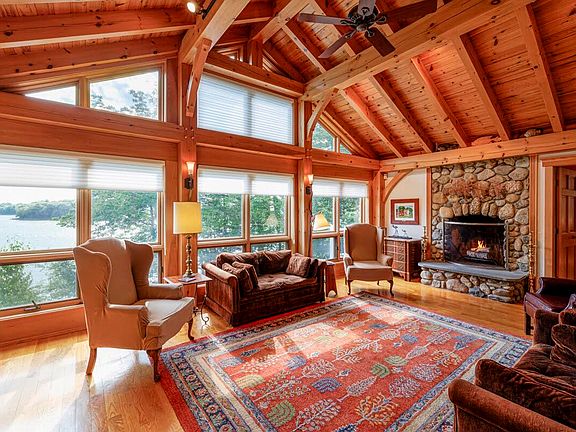 The home features three bedrooms and three and a half bathrooms, with the primary bedroom and its en-suite bathroom conveniently located on the first floor. The spacious layout includes two fieldstone fireplaces and granite countertops, creating a cozy and elegant atmosphere. Enjoy river views from many rooms and take advantage of the deep water mooring with a 4500 lb capacity.