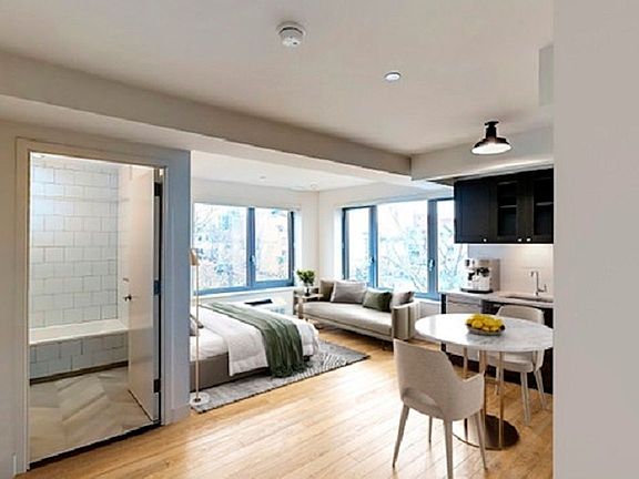 207 is a lovely North facing studio, that features a modern kitchen with stainless steel appliances, hardwood floors and in unit Bosch Washer & Dryer. Kitchens include custom imported cabinetry and mill work, quartz countertops, stainless appliances from Bosch and Fisher & Paykel. Situated on an acre of land, 180 Franklin Avenues modern new rental residences and creative amenities border Brooklyns trendy Clinton Hill and historic Bedford Stuyvesant neighborhoods. Bold, modern, and fun, with a shot of urban luxury, studios, 1 & 2 bedrooms, and duplexes feature state of the art kitchens and bathrooms as well as in-unit washer dryers. Select units also offer large private outdoor patios. Of-the-moment amenities include a vibrant social lounge with pool table, full circuit and cardio fitness center, sound proofed music rehearsal space, artist workroom, bike storage, and on-site parking. 180 Franklins fully landscaped roof deck and features barbecues, outdoor seating and dining areas. The neighborhood is dotted with parks, diverse eateries, and gorgeous turn of the century brownstones and row houses. An easy trip to the Pratt Institute and eclectic local shops, 180 Franklin Avenue is also close to the G, A & C subway lines. Images are of a similar unit.