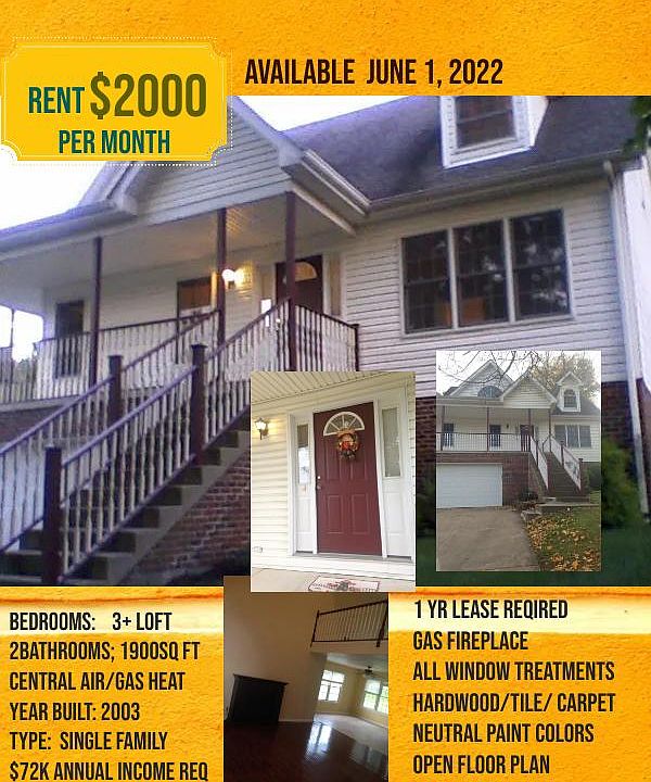 Spacious 3 bedroom + loft area, 2 bathroom, 2 car extra large garage with automatic openers and remotes and lower level laundry facilities. Beautiful hardwood floor in LR with a gas fireplace and cathedral ceilings. Open floor plan into large eat-in kitchen with island, stools and stainless steel appliances included. There's 2 bedrooms on the first floor and the third is on the 2nd floor. This home is well-maintained and includes all window treatments and screens. Door from kitchen leads to patio for grilling and plenty of back yard to enjoy...AND the landlord cuts the grass! A one year lease is required along with first month, last months rent and security deposit of same for a total of $6,000 upon signing of the lease. No pets and no smokers. Tenant pays all utilities. No pets and no smoking.