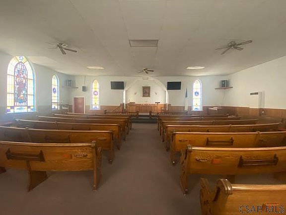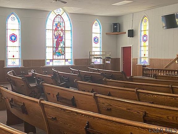 Former place of worship. This building has one level consisting of 1984 sq feet. The basement is fully finished with 1984 Sq Ft for a total of 3968 usable square feet. The Main Floor has an open floor plan with tall stain glass windows. The walkout basement has an open great room, several offices, kitchen and restrooms. 2 forced air furnaces. Sewer is complainant. Paved parking lot in rear of building. Many possibilities. Zoned R1, Call for list of permitted uses.