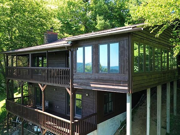 Piedmont View and the surrounding mountains at it's best! Enjoy this 2081 sq. ft., 4 bedroom, 3 bath home located right off the Blue Ridge Parkway. On the main level you have a living room with 6" tongue and grove pine flooring and a wood burning fireplace that leads out to the covered deck with a view of the Piedmont of North Carolina, kitchen with oak cabinets and all appliances conveys, master bedroom suite with a hand crafted 11' x 16' sun room featuring surrounding windows to enjoy the view and the spacious master bath has a view also, another bedroom, bath and laundry area. On the lower level you have 10' ceilings, Parkay flooring, a den with a wood stove that leads out to another deck over looking the Piedmont, 2 more additional bedrooms, bath and an unfinished hobby room. Home features Hemlock siding, metal roof that is 10 years old, 2 x 6"' exterior walls, new stain on home and porches.