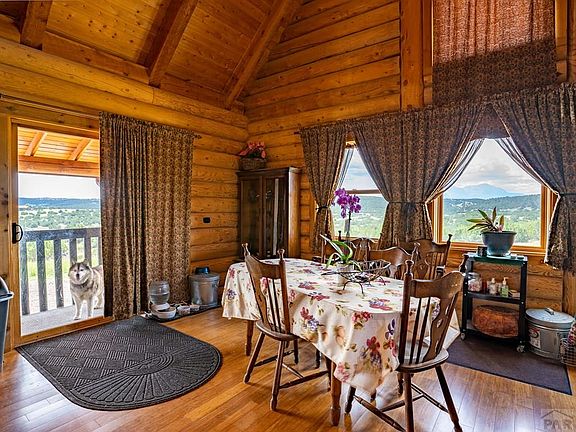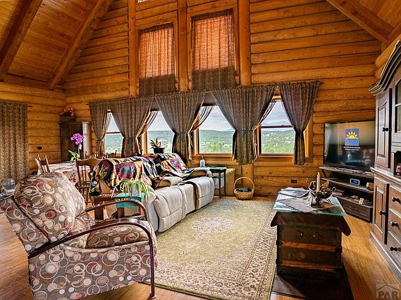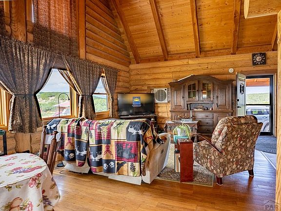 Gorgeous views over 93 acres and a custom built log home in the Silver Spurs Ranch Subdivision! Enjoy the views and wildlife year round. Beautiful kitchen with granite countertops, an island and new appliances. Main level bedroom and laundry for convenience, cedar lined closets, cedar door trim. Wood burning stove in the Living room with vaulted ceilings, and bamboo flooring with a cork underlay, Rock accents are from the quarry in Trinidad. 2 bedrooms, 3/4 bath and additional space in the loft for an office or sitting area. Loft area has pine flooring throughout. Private well with a reverse osmosis system, Solar panels and backup generator. Self sustaining geodome for year round gardening. Large Shed, chicken coop, corral and hives. Call today for your personal showing!