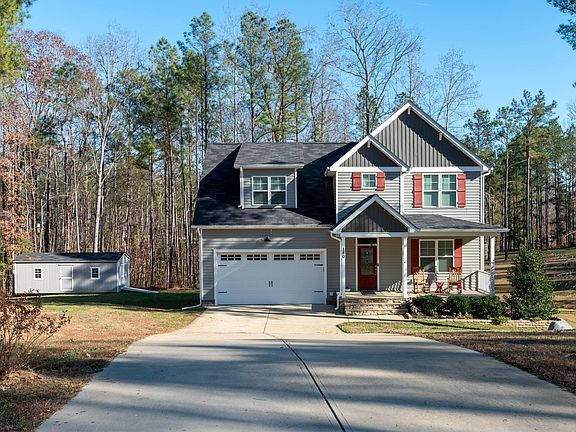 Beautiful 2-story home on spacious 1.46-acre lot with a 12x12 deck. Enjoy the open areas and privacy, surrounded by mature trees. Home has lots of added features such as: Granite countertops, Center island, SS appliances, Gas log fireplace with surround and mantle, and finished crown molding throughout. Large open floor plan with engineered hardwood in the main areas and ceramic tile in the bath and laundry rooms. Whole house water filtration system installed. Smart thermostats and security alarm system. The SS refrigerator and the LP gas tank for the fireplace convey. Primary bath has rainfall showerhead. This home is just over 4 years old and has been impeccably maintained, including regular services to HVAC systems. Also included is a large 12x20 storage building, painted to match the house perfectly.