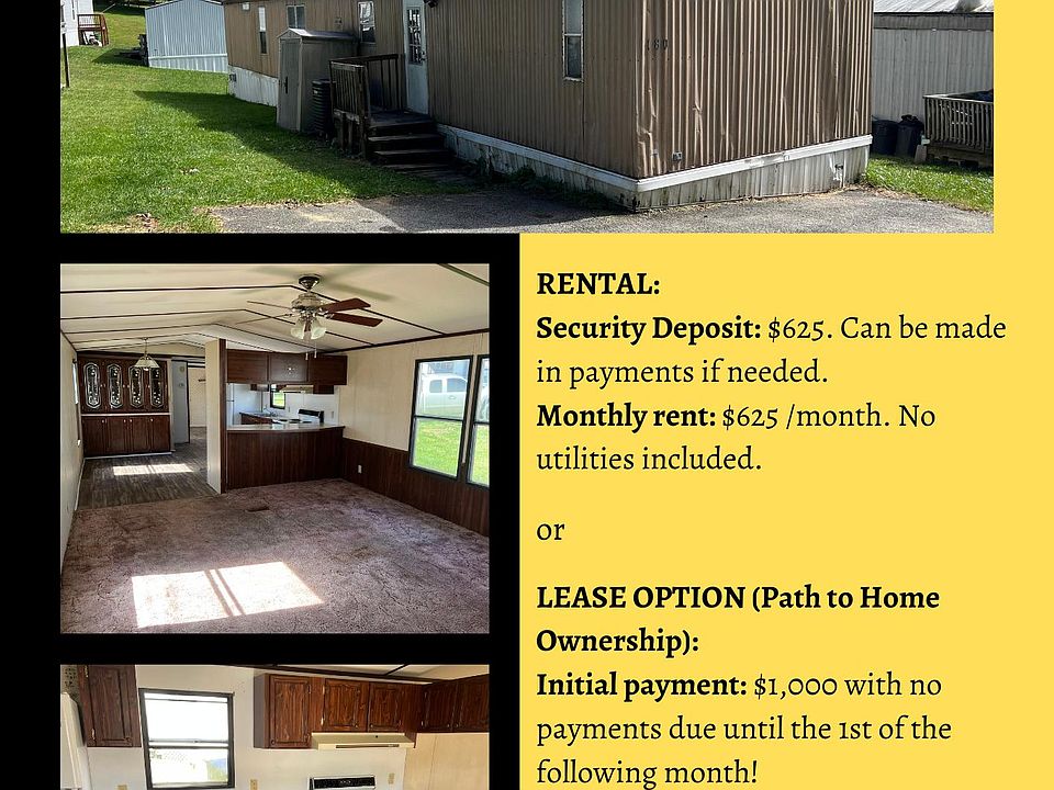 180 Ideal Circle ~ 3 Beds 2 Bath ~ Princeton, WV 24740 RENTAL: Security Deposit: $625. Can be made in payments if needed. Monthly rent: $625 /month. No utilities included. or LEASE OPTION (Path to Home Ownership): Initial payment: $1,000 with no payments due until the 1st of the following month! Monthly payment: $625 /month. No utilities included. 3 bedroom, 2 bath single wide mobile home with central heat & air. This single-wide mobile home features many extras large covered front porch, building for storage of lawn equipment, lots of extra cabinet space, large garden tub in the master bathroom with double doors, oversized shower with seats in the second bathroom, paved 2 car driveway. Christian Management Corporation Office Hours: M-F 9am-5pm & 10am-2pm the 1st Saturday of every month You can view THIS property 7 days a week! Most pets welcome with a $200 pet fee and signed pet agreement. Maximum 2 pets. No aggressive breeds or outside only animals due to insurance restrictions. Clean, safe, quiet, crime & drug free is our goal. We Support Equal Housing Opportunities! Good people with good, bad, low, or no credit but stable employment or Social Security are welcome. Criminal Checks: -NO recent felonies in the last 7 years -NO evictions in the last 7 years -NO sex offenders Is this property not what you are looking for? ChristianMgt.com.
