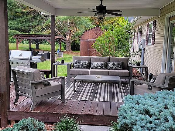 Three bed two bath home for sale. House and property are well maintained. New and mature landscaping surround the house. Spacious rear porch/deck and fire pit/covered pattio for entertaining company outdoors. Also a 12x14 storage shed with loft for lawn equipment and extra storage. Kitchen has stainless appliances that will stay with the house. Open living and dining area. Master bedroom has walk in closet and en suite bathroom. Other two bedrooms have walk in closets as well. Down stairs finished basement for a family room/den or man cave. All appliances will stay with house. New roof, vinyl siding and gutters five years ago. Heating and cooling unit is less than ten years old.