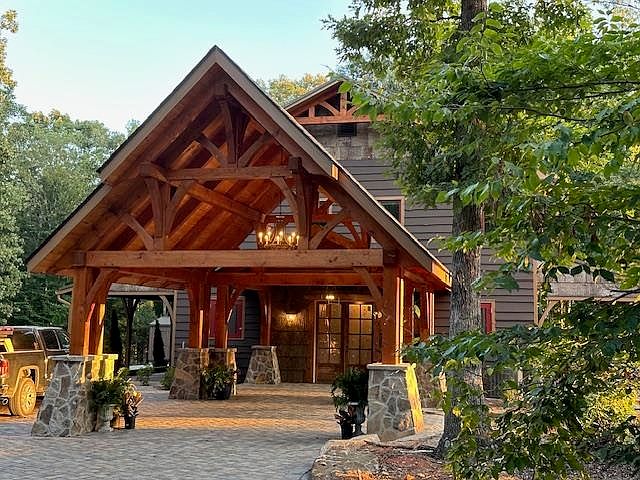 Fabulous equestrian barndominium located in the Enclave at Fairview Farm. This 2BR/2.5BA barn style home is a true delight right from the initial approach, including its custom wood gated entrance, winding driveway, and absolutely stunning timber framed porte-cochère. Inside the home you are treated to refined living spaces. Large gourmet kitchen with high-end appliances and ample work space and storage - including walk-in pantry. Cathedral ceilings, rich hickory plank wood floors, knotty alder doors, wood burning fireplace with gas starter. Spacious primary bedroom and bath, with soaking tub and shower. Outside and around the home, more unique details and blending of styles, including natural bark siding, tree trunk support timbers, and tree limb balusters. The covered balcony deck is perfect for relaxing, dining, or entertaining, and is easily accessed from the interior kitchen/main dining area. There is also a lower level tree house style suspended outdoor patio deck that leads down to a fenced dog yard. The ground level offers a 4-stall center aisle barn with exterior stall doors opening to dry lot and pasture areas. Finished ceilings, wash bay, storage/feed room, fly spray system. mud room main entry, 1/2 bath and laundry. The property also features a new, in-process build of a large detached barn/garage currently to be completed prior to closing. The floor plan can accommodate a variety of uses, including vehicle/equipment storage, workshop, and/or additional horse shelter. There is also a suitable building site for a larger home, as well as space for riding arena, if desired, and there are community riding trails (note: Campbell residents can also acquire membership to the nearby FETA trail system) Additional notable amenities include a whole house generator, dual fuel HVAC system, and propane gas. This truly unique property offers a versatile blend of spacious, open-concept living with the durability and rustic charm of a barn-style home, while at the same time providing a strong connection to the surrounding landscape. Ideal for equestrians seeking a smaller lifestyle footprint and easy-to-maintain property. Don't delay, book your showing today!