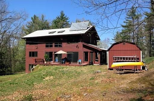 Unique Passive Solar & Solar Hot Water + Propane Heated Contemporary on Hill Top, Abuts Dakin Conservation Land & Trails in So. Amherst. Close to major routes & college hubs. Built in 1986, 3385 SF home has significant upgrades (roof, so.lar panels, Viessmann Hydronic Boiler w/ 6 zones, thermo-pane replacemt windows & skylights, sewer hookup, repaved driveway, A/C units, upgraded baths) Stunning high ceiling w/ windowed walls, 4 bedr., 4 baths, sep. entry office/in-law suite, storage galore.