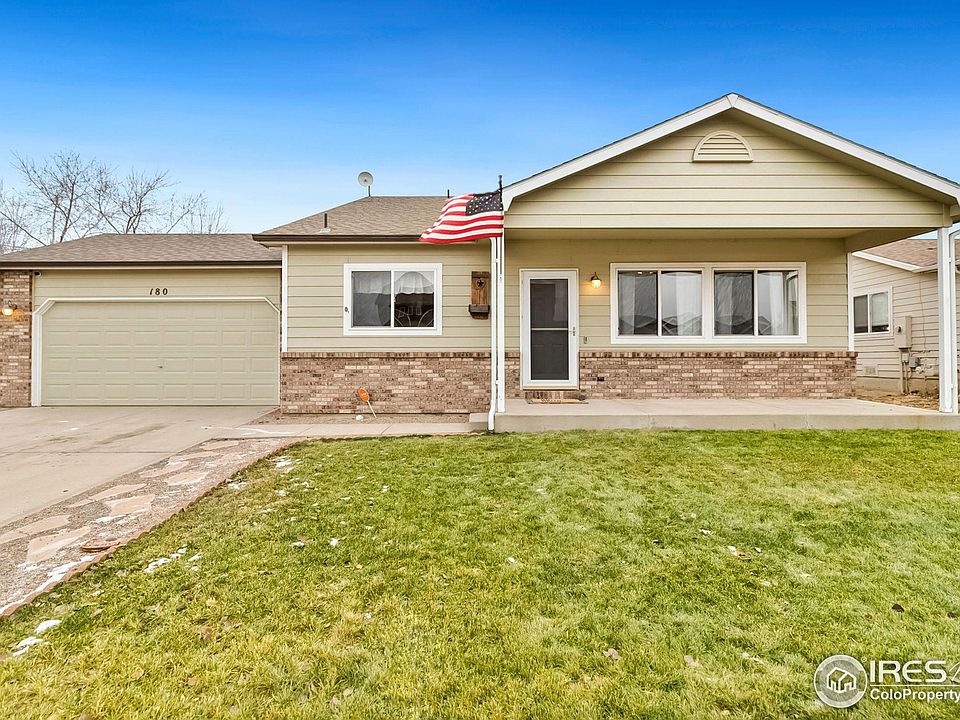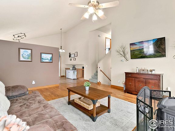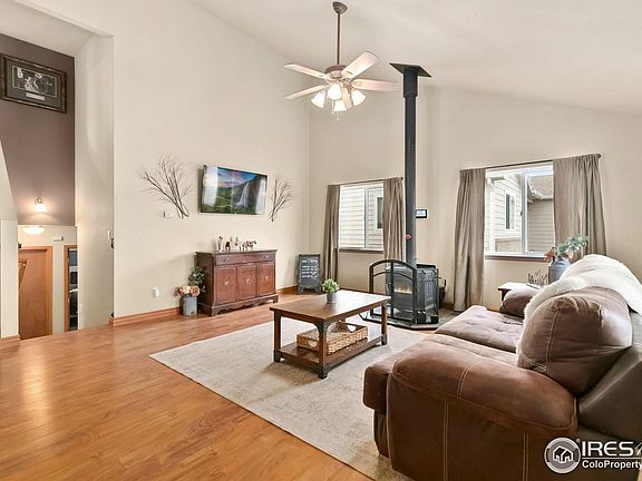 Natural light warms every room of this charming home. Enter into a vaulted and open living room graced with new wood laminate flooring made extra welcoming with a wood burning stove and many sunny windows. The bright kitchen offers abundant cabinet and pantry space and a wrap around counter with bar top seating. A lower level family room or dining room enjoys a corner fireplace and multiple garden level windows. The primary bedroom features a walk in closet with double rods and attached full bath. Updates include a renovated 3/4 bath on the upper level with new tile shower, glass doors, vanity, light fixtures and commode. The home has new ceiling fans and a new stainless-steel dishwasher. The unfinished room in the lower level is already plumbed to be a 3rd bathroom. You will love the outdoor space with the large extended back patio and fenced yard perfect for hosting a BBQ party. Landscaping features include a new raised garden bed in back, an updated front garden, lots of flowers, and a beautiful blooming and fruiting pear tree. Two sheds, multiple closets and an attached 2-car garage ensure great storage. Vivint security system equipment is included. Located next to Mountain View and Milliken Fitness Parks!