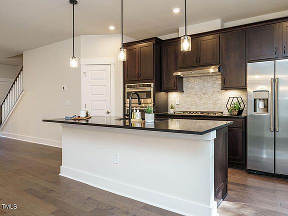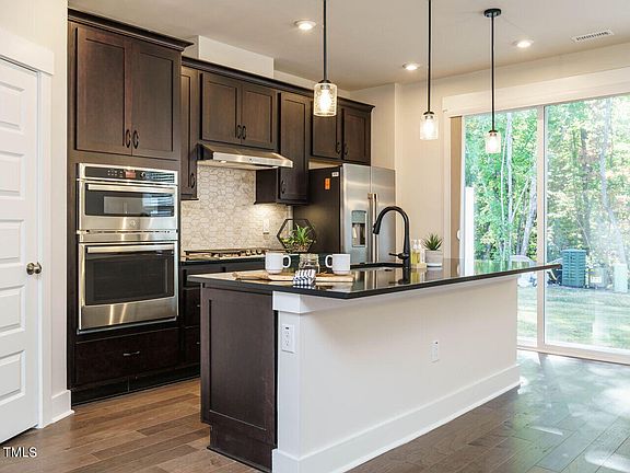 This stunning Chatham Park townhome, just one year NEW, boasts numerous upgrades. It features REAL 5-inch HARDWOOD floors throughout, eliminating carpet entirely. The GOURMET kitchen is equipped with a GAS cooktop, wall oven, TILE backsplash, and a large dine-in island, complemented by upgraded cabinets and under-cabinet lighting. There is plenty of storage in the WALK IN pantry. The open concept includes a spacious family and living room. The one-car garage comes with a 220-volt outlet for electric vehicle charging. Upstairs, the generous master suite includes a walk-in closet and TRAY ceiling, along with a master bathroom featuring an upgraded oversized TILE shower, bench seat, and double vanity. Two additional generously sized bedrooms can be found upstairs with a shared full bathroom. The laundry room is complete with a washer and dryer included. Custom blinds enhance the home's privacy, which backs onto a WOODED preserve area. Residents can enjoy walking trails, parks, and community events, making it a perfect place to embrace the Chatham Park lifestyle. This one truly is a GEM!!