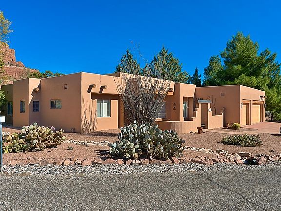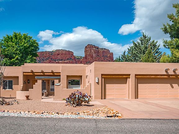 Santa Fe style 3 bed/3 bath, open, single level, split floor plan with spacious bedrooms and custom details. Excellent potential in this sweet, solid home in a great neighborhood ready for your special touch. New vinyl wood flooring and carpeting. Enjoy outdoor entertaining, covered patio and amazing views of the red rocks. Low maintenance/ low utility bills. 3 CAR Garage with large workshop, extra vehicle or golf cart. Beautiful neighborhood and community, just a short walk to the Oak Creek Golf Course and Tennis Courts. Come and see the possibilities!