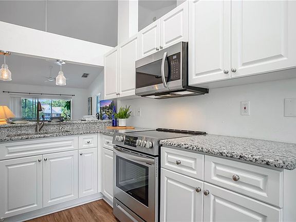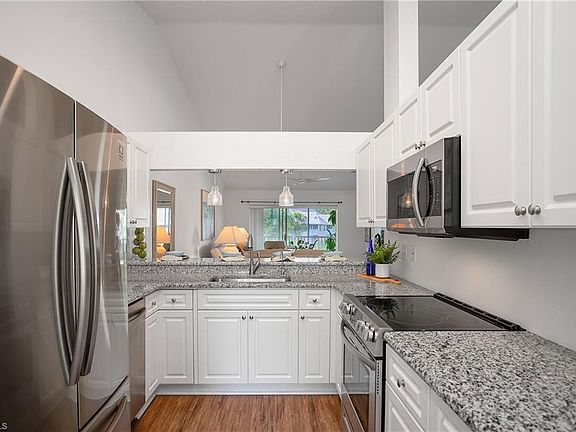 Escape to your own tranquil oasis in this stunning end-unit condo, featuring serene lake views and beautifully updated finishes throughout. The turnkey furnished 2-bedroom plus den, 2 full bath layout is move-in ready, with luxury vinyl flooring adding to the modern, elegant feel. Enjoy added comfort with ceiling fans in every room and lanai. The A/C was installed in 2018, and a new water heater was added in 2020. The updated kitchen features sleek granite countertops and stainless steel appliances installed in 2021, with counter seating perfect for entertaining. Volume ceilings enhance the spaciousness of this 2nd floor unit, while the serene lake views from the lanai provide the ultimate relaxation spot for your morning coffee or evening beverage. This cozy boutique community offers a community pool for your enjoyment and peaceful living, while being located in a prime North Naples location close to shopping, restaurants, and the beach (10 min away!). Don't miss out on this stunning opportunity to make this your dream home!