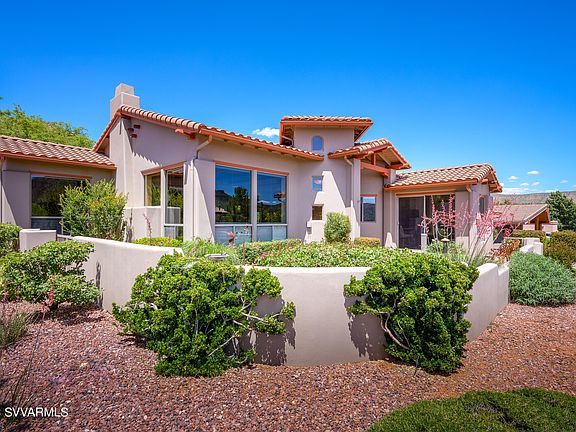 Simply a Sedona Sanctuary, enhanced by mature & lush xeriscape landscaping in both front & back yards with a flowing waterfall feature attracting native birds & providing delight from every vantage point. This three bedroom Sedona home welcomes with a well proportioned & finely crafted design which DWELLS WELL around a central courtyard slowly revealing its secrets. Flowering native plants, roses & cacti surround the waterfall feature. ELEVATED HOME enjoys expansive vistas unfolding into a tapestry of relaxation and beauty. The OPEN & EXPANSIVE split floor plan has primary bedroom, dining area, breakfast room, & great room on one side and the two guest suites on the other, so both you and your guests have a sense of private retreat. See supplement Home is entered from: