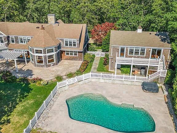 First time to market! Built by current owners in 1981 and completely rebuilt and expanded from the studs in 2007. This Cotuit estate on nearly three acres provides endless generational opportunities. Enter the property via a circle drive with ample parking. The first floor provides an open kitchen-dining area, four-season sunroom with gas fireplace and dry bar, large home office with half bath, TV den and a bonus room with adjacent full bath. The second level boasts a large primary bedroom with private deck, a second bedroom that could also act as a primary and third bedroom, each with their own en suites. Additionally, there is a bonus bunk room as well as a large laundry room. Above the three-car garage there is a fourth bedroom with kitchenette and living room. The deck overlooks the meticulously landscaped and gardened backyard with pool and views out into Popponesset Bay. A private dock brings you down to boat access where the current owners have owned boats up to 24’ in length. B