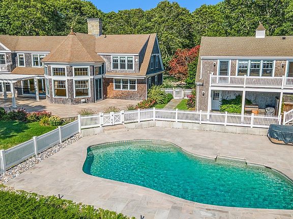 First time to market! Built by current owners in 1981 and completely rebuilt and expanded from the studs in 2007. This Cotuit estate on nearly three acres provides endless generational opportunities. Enter the property via a circle drive with ample parking. The first floor provides an open kitchen-dining area, four-season sunroom with gas fireplace and dry bar, large home office with half bath, TV den and a bonus room with adjacent full bath. The second level boasts a large primary bedroom with private deck, a second bedroom that could also act as a primary and third bedroom, each with their own en suites. Additionally, there is a bonus bunk room as well as a large laundry room. Above the three-car garage there is a fourth bedroom with kitchenette and living room. The deck overlooks the meticulously landscaped and gardened backyard with pool and views out into Popponesset Bay. A private dock brings you down to boat access where the current owners have owned boats up to 24' in length. Brand new stone pool patio and fence were completed in 2020 and a whole-home generator was added in 2021.