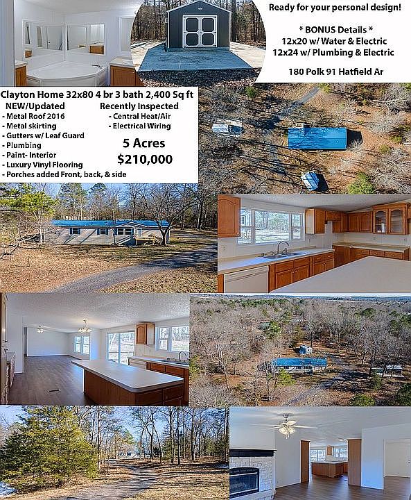 Clayton home 32x80 4 br 3 bath 2400sq ft. Beautiful 5ac close to national forest for activities. Lots New/Updates. 2 fantastic outbuilding w/water,electric and plumbing. No owner financing. No rent to own. Please only serious buyers.
