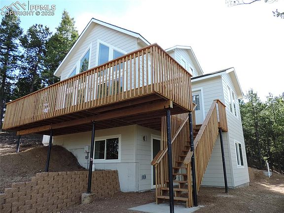 BEAUTIFUL mountain chalet with Expansive windows that bring in natural lighting & nature. The living room features a charming propane log fireplace, soaring cathedral pine ceilings, recessed lighting & it also walks out to the sprawling deck. This home features a double lot with some mountain views. The lot is moderately treed with mature pines. 15 minutes from the town of Woodland Park and amenities. This home was built to take in the views! 2x6 construction, R19 in the walls, R38 in the ceiling. Vinyl thermo pane windows throughout that have a low E factor to prevent fading from our amazing sunshine. The primary bedroom has an attached bath and generous sized closet. The loft space lends room for a home office, a kids play place, or an additional sleeping area. There are beautiful pine ceilings in the rooms with vaulted ceilings. Some rooms have recessed lighting. There are sharp Hickory cabinets in the kitchen & in the bathroom. Newer Luxury Vinyl is throughout the home. The laundry room is tile. "Hardie" fire resistant wood grain siding on the exterior that really holds up great in the mountains. Lifetime brand dimensional shingle roof. Tasteful earthy colors inside & out. CAT-5 prewire for sound systems, telephone & internet. The lower level is poured concrete and features a sliding glass door. The roads are privately maintained. There is a voluntary fee for snow removal & road maintenance. The water source is a 2600-gallon cistern for a water source. Short term and long-term rentals are permitted. Close to Charis Bible College, Summit Elementary school and many amenities.