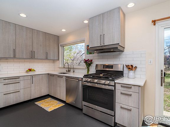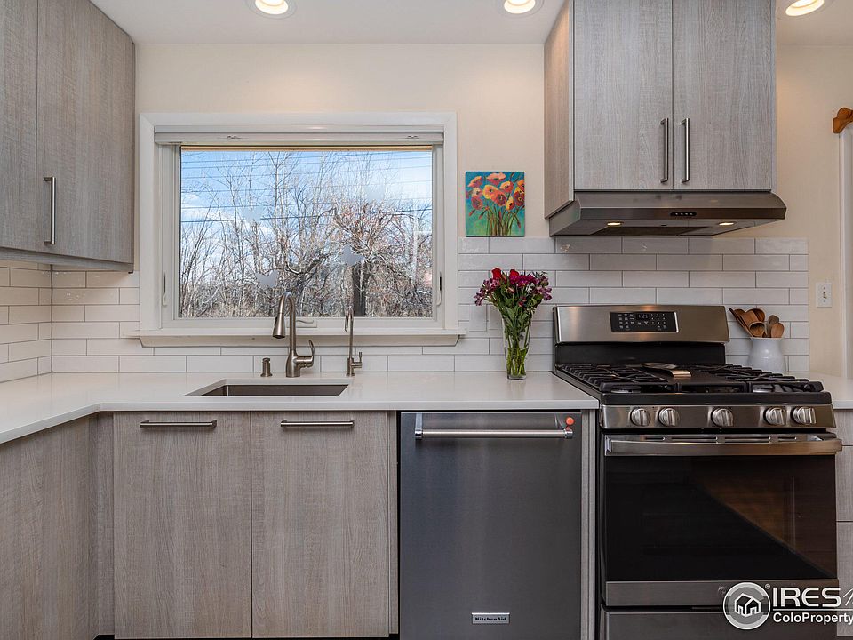 Sunny remodeled 3 BR ranch on greenbelt w/foothills views. Beautifully renovated kitchen w/new cabinets, Caesarstone countertops, Marmoleum floor, + brand-new subway tile backsplash, under cab lighting & GE gas range. Pleasant living room w/great midcentury modern vibe features Hearthstone wood burning stove & large picture window. Open floor plan w/hardwood floors, Anderson windows, solid wood doors, replaced all handles/hardware. Deep 1-car attached garage. Delightful front yard herb, veggie & perennial garden, large front deck, & shady maple tree. Private backyard w/straw-bale chicken coop borders Bear Creek Path greenbelt. Just around the corner to Creekside Elem & lovely Martin Park for picnics, playground, tennis, & more. Bear Creek bike & pedestrian path behind the backyard connects to huge network of Boulder bikeways & paths. Nearby access to The Skip. Quick access by foot, bike or car to restaurants, breweries, & grocery. Peaceful, quiet, location close to the best of Boulder.