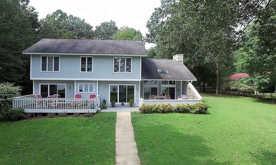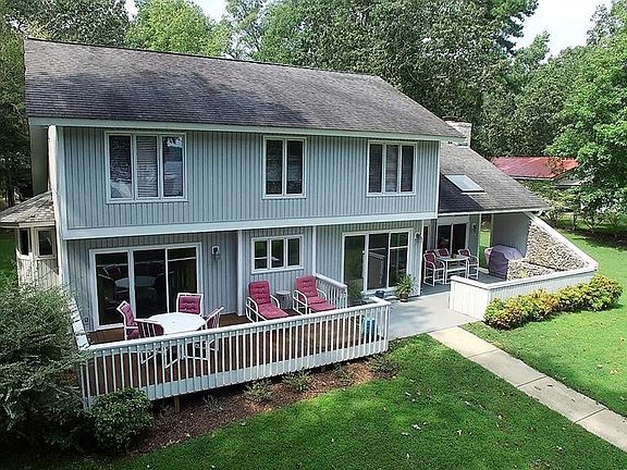 MAIN LAKE with gently sloping lot on south west end of Lake Gaston. Lovely home with main lake views from almost every room. Main level has kitchen with granite counter tops & updated appliances, oak floors, dining area, living room with cathedral ceiling and wood burning fireplace, den/TV room with walled courtyard outside, wet bar and large master bedroom and bath. A half bath is also on this level.Quite open from kitchen through to the living room. Upstairs is a 2nd master bedroom and bath, two guest bedrooms and two undesignated rooms with a third full bath. Outside on the lakeside is a large covered patio with a stone water feature and a large deck. The double boathouse is covered, and has a small living room, plus upper sun deck and lower deck. Large double attached garage, wood three bay carport and gated entrance. A Main Lake Flat Lot w/ Great Lake Views & Privacy - Come See!