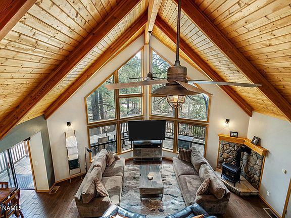 Nestled in a coveted area, this charming chalet is a rare treasure—properties like this don't come around often. It offers the perfect escape, with the highlight being its expansive deck. Take in breathtaking sunsets that paint the sky every evening—this is your daily view. As night falls, the deck transforms into a stargazer's paradise, ideal for both quiet relaxation and lively entertaining. This chalet is fully furnished and reflects pride of ownership throughout. It features tongue-and-groove vaulted ceilings and stunning floor-to-ceiling windows that seamlessly invite the beauty of the outdoors in. Custom shades, ceramic wood tile, and brand-new carpet enhance its character, while the warm cabinetry and chiseled-edge granite add a timeless touch. The primary bedroom is conveniently located on the main floor, with two additional bedrooms and a generous loft space with a sleeper couch for extra guests.
