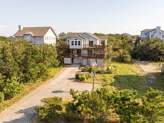 This wonderful 6BR | 5BA home in the heart of Duck provides the perfect setting for making Outer Banks memories! Located in amenity-rich Schooner Ridge, offering a community beach access, indoor and oceanfront outdoor pool, tennis and racquetball courts, fitness center, game room, and playground, you’ll have all the luxuries of resort-style living right outside your door. As you arrive at the property, you’ll notice ample private parking, lovely landscaping with native shrubs and grasses, and a well-kept exterior with wraparound decks for enjoying every inch of the outdoors. The top level was designed with gathering in mind: the massive living and dining area allows for creative furniture configurations, and the kitchen offers great cabinet and counter space and includes a peninsula for additional prep space and casual dining. You’ll also find an elevated ship’s watch along with a bright and spacious sunroom for year-round enjoyment. Vaulted ceilings, sliding glass doors, and expansive windows welcome natural light from every angle. The top floor also features a large suite with ensuite bath with cedar plank detail. On the mid-level, you’ll find four generously sized guest suites (one of which is currently being used as an office). One suite offers an attached private bath and sitting area, and two hall baths (one with standup shower and another with a tub/shower combo) shared by the other three bedrooms. This level is enveloped in a combination of covered and open-air porches, with the natural landscape providing a private, treehouse feel. The mid-level hot tub is surrounded by a privacy screen for peaceful enjoyment. The ground level entry provides a laundry room with ample storage and features a sunny game room with a shuffleboard set and card table. There is also a sizeable guest suite with private bath on this level. Head outside and shoot some hoops while cooking dinner on the charcoal grill. Other conveniences in this home include an elevator and outdoor shower. With a desirable Duck location just steps from the beach, shopping and dining, as well as fabulous community amenities, this well-loved home is ready for you to make your own. Don’t miss out – schedule your showing today!