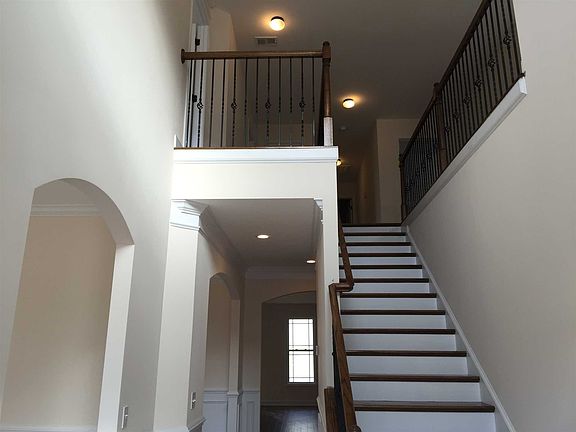 Our popular Eastchester home w/covered porch & gas log fireplace! Walk into the two-story foyer complete w/hardwood floors, 2pc crown molding & wainscoting which opens to the office/living room w/heaving moldings too. The formal dining room also has hardwood floors, coffered ceiling & wainscoting. The spacious kitchen opens to the brkfst room & great room complete w/granite countertops, & upgraded cabinets w/crown molding. This home has a first floor guest suite complete w/full bath w/walk-in shower & linen. The loft opens to the 2 story foyer, the master is complete w/tray ceiling, double vanities & separate tub & shower w/glass surround. This home has all the upgrades- HW in great room, kitchen, and breakfast, wrought iron spindles.