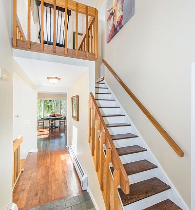 This 4 bedroom, 3 full bathroom custom contemporary retreat features a bright and open eat-in kitchen with SS appliances, center island, custom butcher block countertops, and bay window nook. Situated on a private, wooded 1.84 acre lot, the ground floor includes family room, bedroom, full bathroom, laundry room, and mud room/extra storage. Additional features include radiant heat in floors on main level through hallway and into kitchen, two fireplaces (propane), 2-car garage plus a carport, vaulted ceilings, and deck access from the kitchen, living room, master bedroom and 3rd bedroom (was previously used as office).