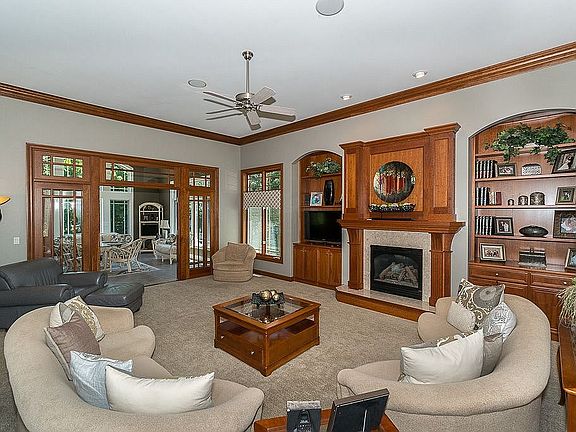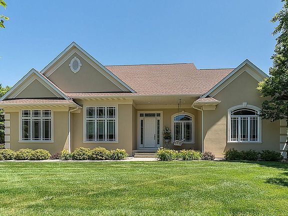 Price Reduced! Absolutely stunning Tuscan style ranch. High ceilings complete with coving and Tray in several rooms. The main level with plush carpet, hardwood floors, arched dividers, and windows. The formal dining room and living room connects to the sunroom with vaulted ceiling. Also on the main level are a bedroom, a full bath, a half bath, and laundry. The kitchen features hardwood floors, Cherry cabinets and trim, granite counters, tiled backsplash, stainless steel appliances, pantry, and a massive island with breakfast bar. Appliances stay with the home. The master bedroom is located on the main level and features carpet floors and a walk-in closet. The attached master bath includes tile floors, solid surface counters, a jetted tub, and tiled shower. The finished lower level features daylight windows, a fireplace, wet bar, 3 bedrooms, 2 full baths, and storage area. Heated garage with 12' ceilings, epoxy floor, and stairway to the basement. Outside you'll find a patio overlooking the yard with mature trees and professional landscaping. Beautiful view. Call or email today for a private