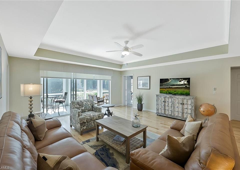 Step into a lifestyle of comfort and community in Tra Vigné — a private, beautifully maintained enclave of just 77 coach homes tucked within the sought-after Vineyards community. This rarely available, first-floor end unit offers the privacy and feel of a single-family home, with the ease and convenience of a lock-and-leave lifestyle. From the moment you enter, the wide-open layout welcomes you with rich hardwood floors, coffered ceilings, and walls of natural light that enhance the home’s airy, inviting ambiance. With 3 spacious bedrooms, 2.5 baths, a versatile den, and a one-car garage, this thoughtfully designed plan provides for both everyday living and effortless entertaining. The expansive lanai — your private outdoor sanctuary, offers serenity as well as hurricane protection, perfect for morning coffee or relaxing after a day at the beach. Residents of Tra Vigné enjoy quiet, tree-lined streets, a short stroll to one of four sparkling pools, and ample guest parking — all within a gated, secure setting. Just outside your door, you’ll find Naples’ best shopping, dining, and entertainment minutes away. For those looking to elevate their lifestyle even further, Vineyards Country Club offers optional memberships to a world-class wellness center and spa, two championship golf courses, tennis, pickleball, bocce, and a year-round calendar of social events that create connections and memories. Don’t settle for just another home — discover a place where every day feels like a vacation. Welcome and cheers to new beginnings!