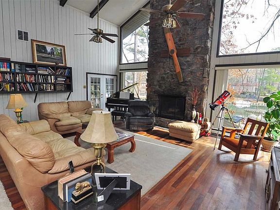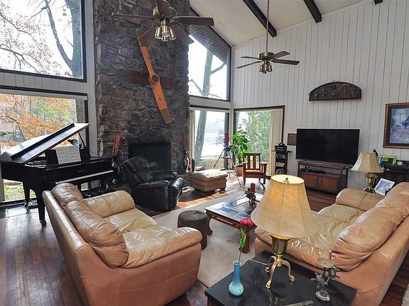 Beautiful lake views year round! Everyday is like being on vacation in this LAKEFRONT home with dock and back yard water fall. Large picture windows from the living room, bedroom and sunroom so you can enjoy the lake views. The home features a metal roof, along with a fenced and gated back yard. The kitchen features granite counter tops, tile floors, tile back splash and SS appliances. Updated master bath with tile floors, separate tub and shower and walk in closet. Newer A/C units.