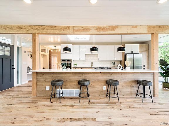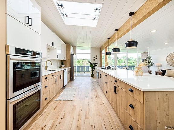 Welcome to this extraordinary MID-CENTURY MODERN house perched on a spectacular lot backing to EMERALD PARK w/ MOUNTAIN VIEWS. This architectural gem captures the essence of a bygone era while seamlessly blending modern comforts for contemporary living. Situated on a spacious 12,000 sqft lot w/ manicured landscaping, this home exudes charm & character from the moment you arrive. The sleek & modern kitchen boasts a jaw dropping center island fit for 5-6 people, SS appliances, DOUBLE OVEN, gas stove, ample storage, & a minimalist design that complements the overall aesthetic of the house. Step outside to a deck stretching the width of the house & be amazed by the incredible views; sit back & enjoy the CO sunshine or host gatherings with friends and family. The thoughtfully placed windows & skylight flood the interior w/ natural light. Retreat to the PRIMARY SUITE w/deck access, more VIEWS, an an en suite bathroom custom finished w/timeless tile designs. The main floor is finished w/2 additional spacious bedrooms & a large bathroom. The WALK-OUT BASEMENT boasts a gas fireplace, a HUGE WET BAR, and plenty of room relaxation or entertainment. With two bedrooms downstairs, and three upstairs, you have no lack of room to host guests, create an at home office, or create any type of room that suits your needs and style. Enjoy morning walks in the adjoined park, stroll on over to the Bay Aquatic Park w/endless activities for kids or the beautiful Broomfield Community Center. Enjoy restaurants or shop to you hearts delight at nearby Broomfield Town Center! W/ easy access to Highway 36, this home truly has it ALL! Your DREAM HOME awaits! Seller willing to offer $15,000 concession for windows with full price offer.