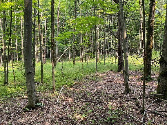 This completely wooded 28 acre parcel has some nice dirt country road frontage and varied terrain but also a rushing creek running through the land. Mostly hardwood trees with a few sections of evergreens. Ideal hunting or ATV and dirt bike riding land. Electric stops down the road at a neighboring house.