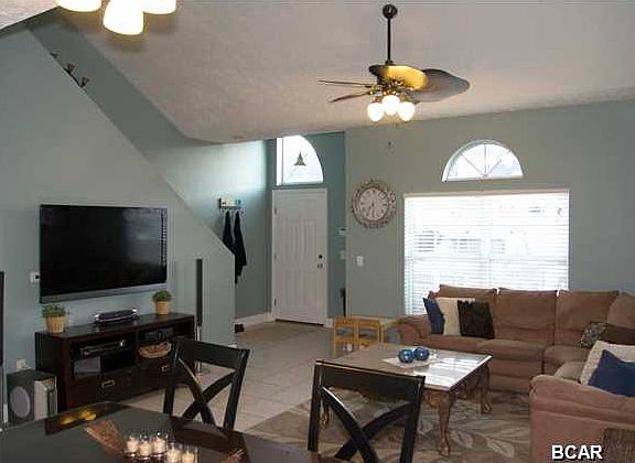 .....Don't miss this opportunity to own this spacious 3 bedroom 2&1/2 bath townhouse/duplex in Palm Cove! This home has a fantastic floor plan. The living room and dining room have soaring ceilings, tiled floors, and lots of light. The kitchen is spacious, functional, and has all appliances. A large pantry, half bathroom, and utility room are off the living room also. The master bedroom is on the main floor along with the master bathroom which boasts a good sized closet and large window. Two bedrooms & one bathroom are upstairs. This property is backed up to a very large grassy area. Palm Cove is centrally located and the beach and Shipwreck Island Water Park is so close you don't have to drive! Restaurants and entertainment are very close with Bonefish and Another Broken Egg right across the street. Palm Cove is a gated community with two swimming pools, a volleyball court, and a play area for kids. This property is unit 180 only and is being sold as-is. Buyer to verify information. Age, SF, lot and room sizes are approximate. Please verify if important.