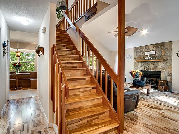 PRICE IMPROVEMENT!!! Welcome to your new home, amidst the lush trees, providing you privacy and tranquility. This charming home boasts two back decks, as well as a covered porch with a soothing water feature. This home offers three levels of living space, making it perfect for families of all sizes; also has upgrades!! Inside you'll feel the warmth and invitation of cathedral ceilings and bright natural light. On those cool evenings, cozy up by the stone fireplace, setting the perfect ambiance as you prepare dinner in your beautiful kitchen with sleek quartz countertops, stainless steel appliances, ceramic floors and backsplash. With ample cabinets and counter space, you'll enjoy the effortless flow of this kitchen and a cozy built in breakfast nook. The primary bedroom is on the main level and a great bathroom with large ceramic tile. Upstairs, the second bedroom and bathroom, and a loft area offers privacy and versatility. Downstairs is the laundry with ample storage, single car garage, half bath and a rec room. With minimal yard maintenance, it allows you to spend more time enjoying the comforts of your new home. Don't miss the opportunity to enjoy this charming retreat!
