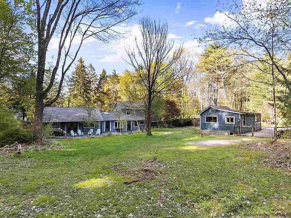 This 1930's gem has all the charm and character one seeks in a weekend or full time getaway. Old world meets new! Once you enter through the gate it feels like a private oasis. A cottage-farmhouse style on the exterior, rumored to have begun as an old carriage house, leads into a very well equipped country kitchen. But wait! Turn the corner and enter two very large and sunny dining and living room spaces, with beamed high ceilings, skylights and outdoor access everywhere. Open to the living room is another space currently set up as a play area that could be enclosed for a first floor bedroom or office. Upstairs there is a Master bedroom, two guest bedrooms, a half bath and laundry. An adorable outbuilding awaits restoration and someone's personal touch to transform it into an artist's or writer's studio, yoga, media, or summer sleeping cottage with it's own front porch. Extensive decking with a hot tub overlooks a lovely fenced in yard. A very manageable property for those seeking country life all within 10 minutes of the Village of Woodstock. New Boiler, generator and updated kitchen and baths. Ready for you to move in and enjoy the nearby Snake Rocks hiking area among all the other attractions in the area -Hiking, Bicycling, Kayaking, Arts and cultural events galore. Lots of nearby dining, shopping and music as well.