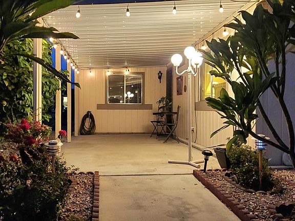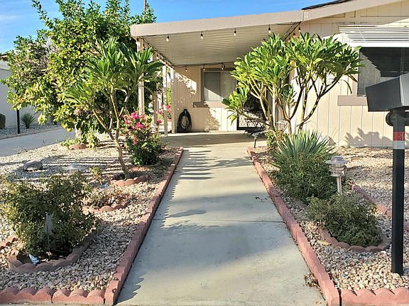 In the 55+community of The Canyon in Cathedral City lies a beautiful manufactured home park. It is known as a premier park. The streets are wide and the grounds are kept beautifully. This home is special because it has two ensuite bedrooms on either side of the home. Most of the home is origninal so you can make it your own. The floors are beautiful and the home is spotless. The shed is very large with plenty of shelves. Right next to the home on the west side is a walk through path that leads to the clubhouse, pond, and all the fun activies like tennis, pickleball, shuffelboard, swimming, parties and dinners! The library is beautifully organized and also is the room for cards, puzzles and Mahjong. Our gym have several great machines for workouts and of course billards is always fun. Poker tables are in that room too.Please READ...The Canyon qualifies their residents meaning you must have a credit score of at least 750, prove income of at least $2800 per month with statements from the bank. You need six months worth. And the pooch, if you have one must be under 20 pounds. One dog is allowed. Cats and birds are also welcome.