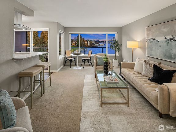 Beautifully remodeled waterfront condo in coveted Madison Park! Gorgeous views of Lake Washington & the Cascades! Remodel completed in 2017. Cook’s kitchen with chic white cabinets, slab quartz counters, glass subway tile backsplash & under counter lighting. Stainless steel appliances; Summit “in-genius” refrigerator, Samsung 4-burner convection & induction range + warming drawer & dishwasher. Sliding door to a private, covered, new acacia lined deck to enjoy the views. Spacious bedroom. Full tiled bath with heated floors & clever storage. Spacious laundry rm with full size washer & dryer, counter space, built-in cabinetry & filing drawers. Added insulation. Private dock. Secured; covered parking space, storage unit, bike & kayak storage