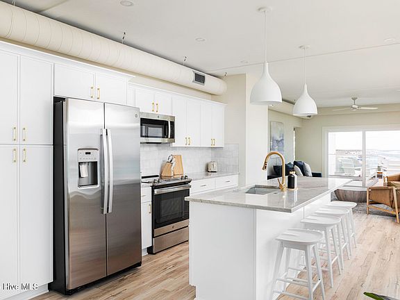 Nestled in the coveted North End of Carolina Beach just behind the iconic Carolina Beach Pier, North Pier Condominium has been completely transformed—now featuring high-end designer finishes and upscale upgrades throughout. This oceanfront retreat offers a resort-style lifestyle with a stunning pool, hot tub, and expansive sun deck boasting unobstructed Atlantic views. The Duke floor plan provides front-row access to coastal beauty, smartly designed for full-time living or relaxing getaways. Every Duke unit is an oceanfront end unit, offering spectacular views from nearly every angle. Spanning 1,203 sq ft, this 3-bed, 2-bath layout emphasizes natural light, open-concept living, and seamless indoor-outdoor flow. At the heart of the home, the kitchen shines with all-wood micro-shaker cabinetry, Brazilian quartzite countertops, a deep stainless steel sink, floating teak shelves, designer white range hood, and GE® stainless appliances. A stylish tile backsplash ties it all together, while the open layout connects the kitchen to the dining and living areas—each offering panoramic ocean views. Slide open the glass doors to a spacious covered deck—perfect for morning coffee or evening sea breezes. The primary suite offers private deck access and peaceful ocean views. Two additional bedrooms provide space for guests, family, or a home office, with a second full bath conveniently located nearby. Each residence includes two ground-level assigned parking spaces, an EV charging station, a new elevator, and dual staircases. Just steps from Freeman Park, High Tide Lounge & Tiki Bar, and multiple beach access points, North Pier blends coastal charm with modern luxury—just a short drive from Wilmington.