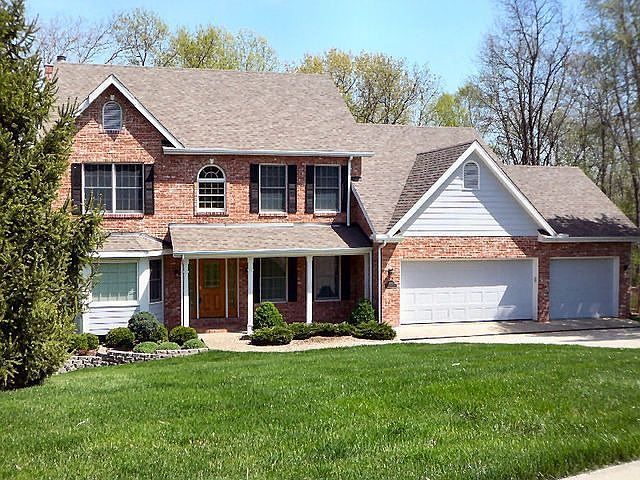 This traditional 2-story home features formal dining room, two family rooms, master bedroom with fireplace, four season porch with adjoining deck, 3-car garage and in ground sprinkler system. Kitchen features beautiful oak flooring, granite composite counter tops and back splash, cherry cabinets with built-in desk, center island with Jenn Air cook top, breakfast area & door to porch and adjoining deck. Bay window and pocket doors to family room highlight the formal living room. Crown molding & chair rail add a touch of elegance to the formal dining room with hardwood floor & carpet inlay. Main-level family room offers woodburning fireplace with insert and blower flanked by built-in cherry bookcases and wooded view. Master bedroom features vaulted ceiling, gas fireplace, master bath and private deck. Spacious lower-level family room includes built-in bookcases, tv area, wet bar, room for the pool table (included) and the 5th bedroom which can also be used as a home office. Lower level has additional 850 square foot music studio or media room, workout room, storage room, closet, and small office area in addition to a John Deere room with double doors opening to the large lower deck area. Relax on the four season porch overlooking private, wooded backyard. Close to schools, shopping and Katy Trail. All New Insulplank Siding and gutter system installed in 2014.