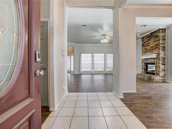 The one you have been waiting for! This home has a great floor plan on a corner lot and has been upgraded with solar panels and a water softener. A large living area that features a see through fireplace into the dinette with gas logs. Granite countertops in the kitchen and a pantry. The primary bathroom features double vanities, whirlpool tub, and his and her closets. There is a storm shelter, sprinkler system and much more. This amazing neighborhood has a park, walking trails, and a pool! You won’t want to miss this one!