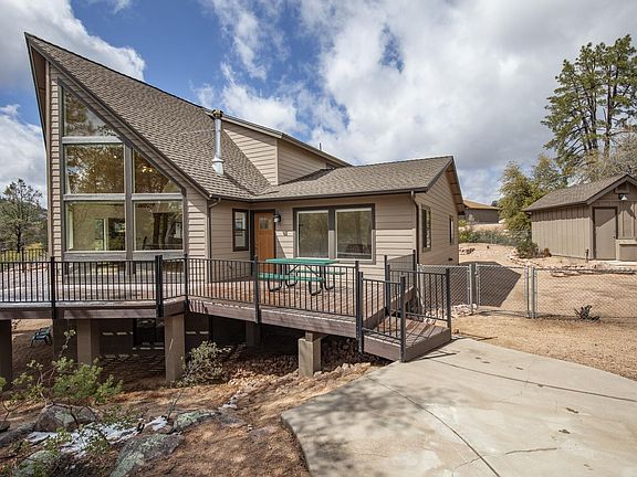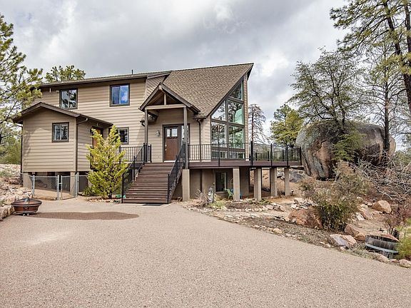 Enjoy the amazing mountain views of the Granite Dells Landscape, huge boulders, tall ponderosa pines and private setting. Home interior features open living concept with kitchen and family room, wood burning stove, natural lighting throughout the home, floor to ceiling windows, and vaulted tongue and groove ceilings. Kitchen features include eat in dining, breakfast bar, granite countertops and walk in pantry. Main level also includes master bedroom with large master bathroom, second bedroom, full bath, office, and den/media room or formal dining room, large laundry utility and mud room. Upstairs features three bedrooms and large bathroom, with loft. Finished basement with unlimited possibilities for family room, hobby room or whatever fits your lifestyle. New carpeting and paint inside.