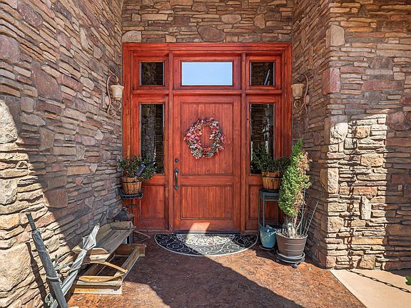 Step into this exquisite single-level residence, thoughtfully designed with no interior steps and breathtaking mountain views. The inviting entryway opens to a spacious great room, showcasing floor-to-ceiling wood-clad windows, large beams, vaulted ceilings, high ceilings, Eight foot solid wood doors, and a cozy gas fireplace adorned with rock accents. Dual ceiling fans enhance the ambiance, while the expansive windows flood the space with natural light and uninterrupted views of the mountains. This home boasts a gourmet kitchen featuring a gas cooktop, convection microwave, a large oven, two dishwashers, a central kitchen island, and an abundance of storage, including a walk-in pantry. Enjoy casual meals at the breakfast bar or in the eat-in dining area, or entertain guests in the formal dining room. The well-insulated home offers privacy with a split floorplan. The primary suite includes a fireplace, ambient lighting, and direct access to a covered patio. The spa-like bathroom features a soaking tub, a spacious walk-in shower, and an expansive walk-in closet. There are three additional bedrooms. One bedroom has its own full ensuite and access to the patio, while the other two share a connected bathroom. One of these bedrooms is currently being used as a versatile office/bedroom combo. Storage is abundant throughout the home. The oversized garage accommodates three vehicles and a golf cart. Outside, you'll find a beautifully landscaped entrance with a small courtyard and water feature, while the backyard offers a stamped concrete patio, fencing with gates, and a drip irrigation system for easy maintenance. This home blends comfort, style, and functionality. Schedule your appointment today and make it yours!