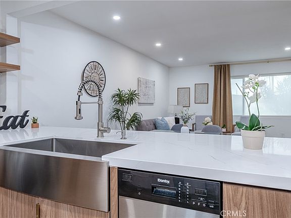 Discover the charm of this spacious single-story condo-home nestled in a cul-de-sac in Orange, where you'll enjoy the luxury of no neighbors above or below. This delightful residence features one primary bedroom and a versatile bonus room, perfect for an office, creative space, or hobby area. The interior boasts beautiful wood-like flooring that elegantly anchors the open living spaces. Step into the modern kitchen, where you'll be greeted by stunning quartz countertops, a chic subway tile backsplash, and a generously sized contemporary sink. Floating shelves provide stylish accents, while the expansive serve-over bar invites casual dining and lively entertaining. The full bathroom has been thoughtfully upgraded with a beautifully crafted wooden vanity and custom half-tile walls that add a touch of sophistication. Both the primary bedroom and bonus room feature sliding doors that seamlessly open to a large, inviting patio area—perfect for soaking up the sunshine or hosting outdoor gatherings. An added convenience is the interior laundry area, which makes everyday chores a breeze. The Homeowners Association (HOA) covers essential services such as water and trash. Residents can indulge in the community's amenities, including a refreshing pool, relaxing spa, and BBQ area, all just a stone's throw away from the Villager at Orange Mall. This prime location places you within walking distance to parks, shops, and an array of dining options. Plus, you'll find yourself in the highly sought-after Villa Park School District and conveniently close to freeways 55, 91, and 22, making commutes easier than ever.