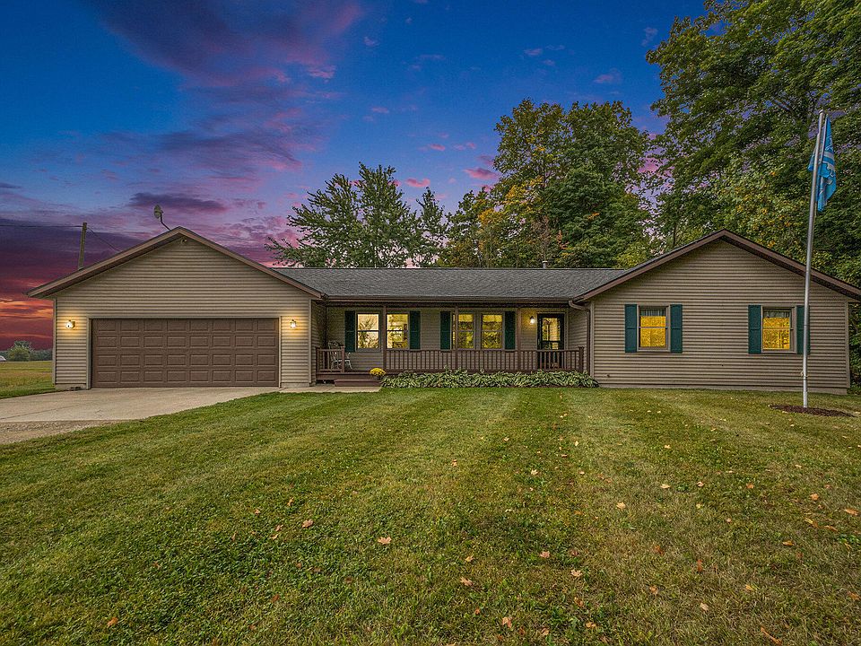 Country ranch on 5 acres with heated 32'x54' barn! Thoughtfully renovated and built with efficient 2x6 construction, this home offers a spacious main level featuring 3 bedrooms and 2.5 baths, including a private primary suite with walk-in closet. The open living room flows out to an upgraded deck and patio where you can take in breathtaking views of rolling hills and mature forest. Main-floor laundry adds everyday convenience, while the lower level offers a large recreation room and plenty of storage. A new roof was installed in 2023, giving peace of mind for years to come. The property also includes a heated 32'x54' barn with hot water—ideal for hobbies, projects, or extra parking. Set in Carlton Township, this home provides the perfect balance of rural tranquility and modern comfort. Nearby, residents enjoy four-season recreation at Charlton Park on Thornapple Lake, the Paul Henry-Thornapple Trail, and the natural beauty of Barry County's rolling countryside.