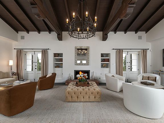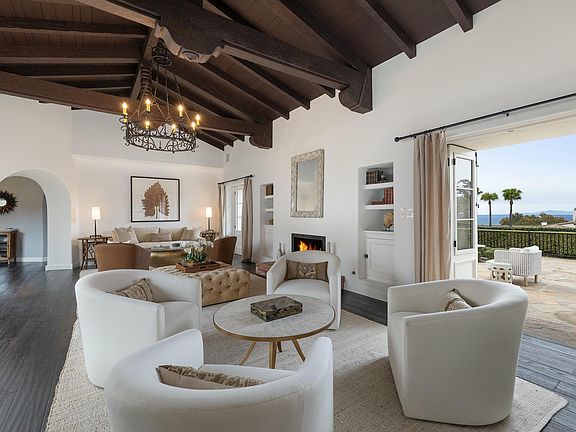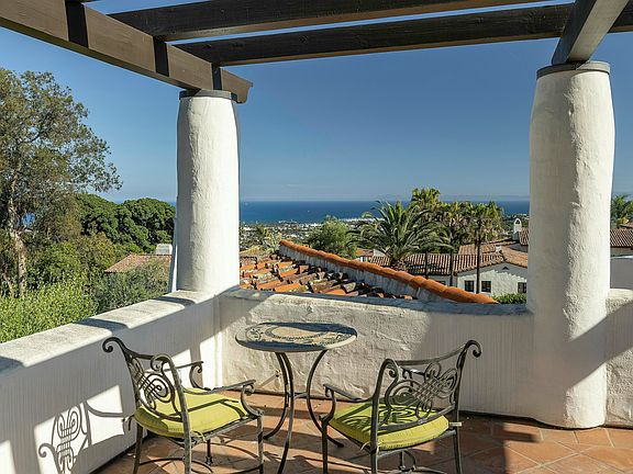 Located in the prestigious Upper Riviera of Santa Barbara, 1800 El Encanto offers a perfect blend of tranquility and ocean views. This magnificent 1930 Spanish Colonial residence was designed by the esteemed architects Edwards and Plunkett, creators of the iconic Arlington Theatre, one of Santa Barbara's premier cultural landmarks. Lovingly restored and remodeled, this historic hacienda exudes elegance and privacy, with beautifully landscaped grounds and vibrant orchards where you can enjoy harvesting your own oranges, grapefruits, lemons, and limes. Upon discreetly entering past the three-car garage, you are greeted by a grand walled portico courtyard, complete with a central fire pit and a romantic, ornate tiled fountain surrounded by stately olive trees and the impressive rotunda foyer. The elegant living room, with its soaring beamed ceilings, opens onto expansive patios that offer ocean views. A tiled stairway leads to an arbored upper-view deck, perfect for hosting unforgettable receptions. Adjoining the gourmet kitchen, equipped with chef-grade appliances, is a spacious living room with rows of French doors and a sophisticated formal dining room. The residence features two luxurious primary suites, each adorned with authentic arched doorways and ocean vistas. Two additional guest suites offer new bathrooms and generous closet space, providing ample accommodation for family and guests. Throughout the home, restored period details abound, from graceful arches and wooden beams to wrought iron accents and meticulously crafted exterior shutters. Recent upgrades include a new roof (2018) and retrofitting, ensuring modern comfort and convenience. Living in this refined property grants you a private pathway to exquisite dining at the Five-Star El Encanto Hotel and the historic Riviera Theatre. We are confident you will be enchanted by this storied offering on the Riviera - a sanctuary of sophistication and charm.