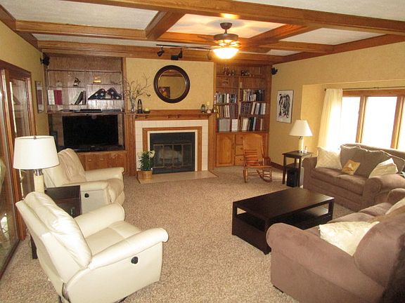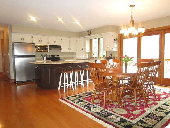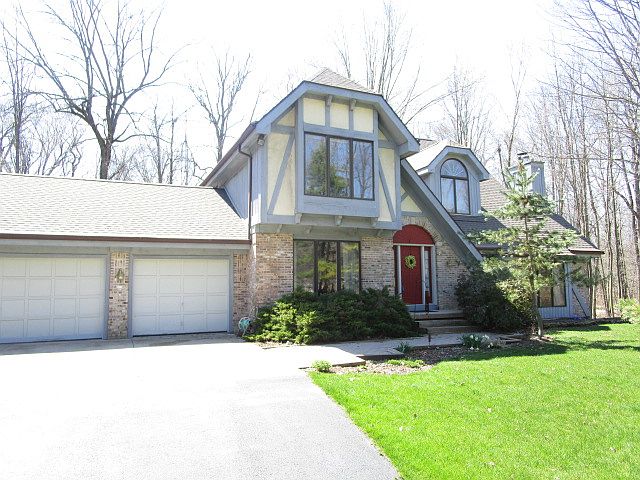Stately custom built Tudor by MCI builders. Coffered beamed ceiling in grand living room highlighted by big light giving windows and warmed by wood fireplace. View into the spacious tiled and windowed 3 season room. Family size kitchen and combo dining room updated with granite countertop, newer appliances, oak floors, and triple windowed French door to entertainment size deck. First floor Laundry Room and Half Bath and welcoming foyer with banistered staircase to upstairs, add to the convenience of this home. Second level you will find a grand Master Suite with walk-in closet and windowed reading nook. Oversized master bath with double sink, granite counter top, walk-in shower and tile floor. 3 additional bedrooms feature double closets. Large guest bath complete this floor. Partially finished basement includes large family rec room, office, and large storage utility room. 2 car attached garage and 3 car detached pole barn provides storage for all your cars and toys. House is set back from road with deep front year. Wonderful wooded backyard, (9.73 total acres total) with fire pit and playhouse. You will enjoy all this lovely home has to offer.