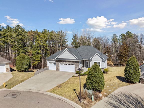 Custom home in private cul-de-sac! Light and bright rambler. Open floor plan offers wall of windows that provide plenty of natural light and gorgeous view. Main level feature vaulted ceiling, mud room off garage with bench and hooks, laundry, office, living room with fireplace, dining room with access to maintenance free deck, Custom white enameled kitchen with large island, coffee bar, wall oven, pantry, exhaust fen/hood, and backsplash. Walk-out lower level with in-floor heat has large cozy family room, library with sitting area and fireplace, exercise room, storage area, second laundry. Home is equipped with build-in speakers. Wood floors, granite, tiled showers, throughout the house. 3car garage is oversized, insulated, painted and floor epoxy. Privet clean backyard with beautiful pine tree, sprinkler system, seating area, fire pit, shed and trail right from yard. Location close to parks, trails, shopping's, dining, school, easy access to HWY 169/55.