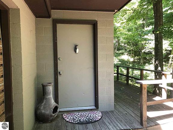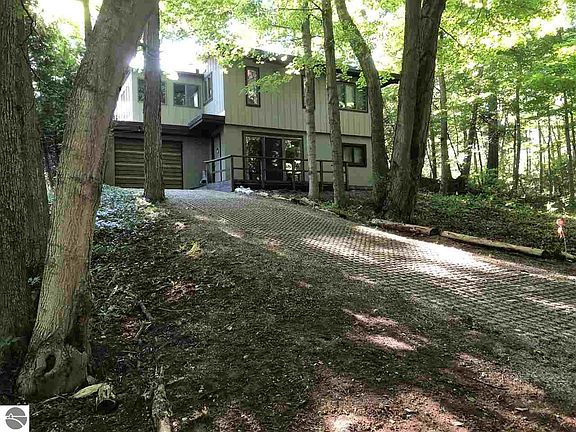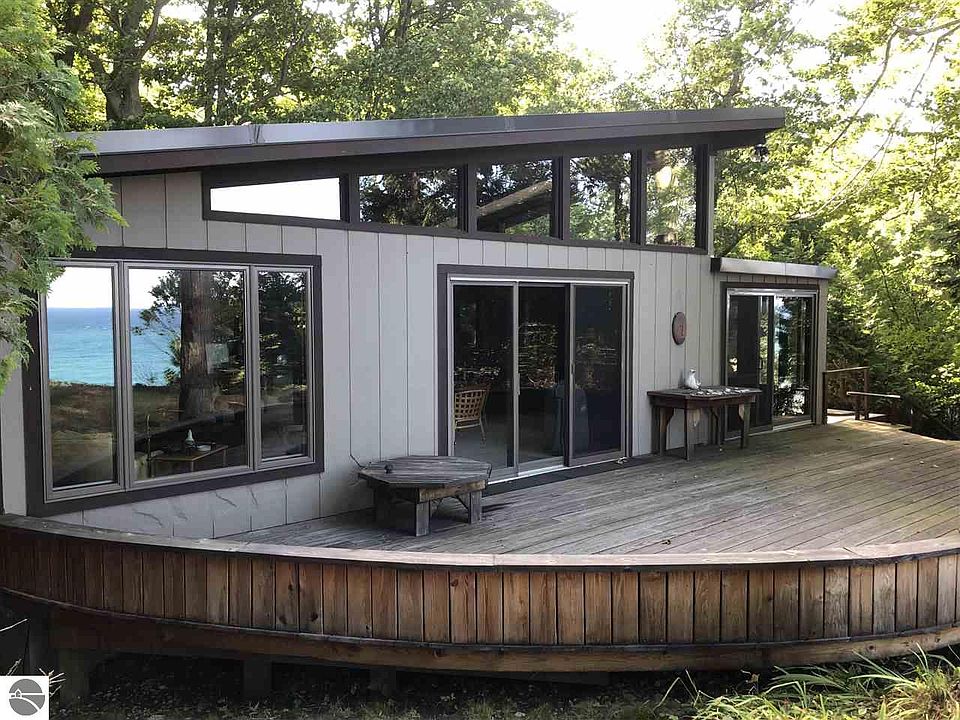 Lovely Lake Michigan views, stairs to the beach and a great all season cottage in the over six acres of woods, allows privacy and quiet. Main floor bedroom and a glass enclosed sleeping porch with efficiency kitchen are the perfect arrangement. The wood burning field stone fireplace in the great room adds to the special ambiance. Just outside the glass doors from the great room is a spacious deck for viewing great sunsets, and a smaller deck on the east side to escape the wind. Two sweet bunk rooms, bathroom, all purpose room and laundry and utilities are on the lower floor with access to the one car garage. Stairs to the beach just off the west deck.
