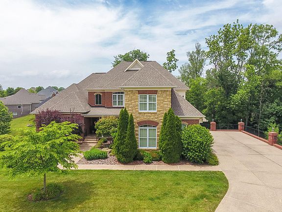 Situated on a peaceful cul-de-sac of desirable Longwood neighborhood and within the award-winning North Oldham County school district, this picturesque stone and brick two-story has been designed for entertaining and enjoying time with family and friends, incorporating a desirable open floor plan, large walk-out lower level with custom-built eat-in wet bar and guest suite, and multilevel entertaining deck with cozy paver patio and fire pit. Featuring fresh paint, exceptional custom finishes, sleek hardwood floors and oversize windows throughout, the first floor begins with a two-story foyer with large arched window and stunning French door entry, flanked by a formal dining room with elegant wainscoting, recessed alcove and triple window to the right, and a spacious study or additional bedroom suite with crown molding, triple arched window and en-suite full bath to the left. The home folds into the two-story great room with tiered picture windows, gas fireplace and convenient built-in bookshelves before opening to the spacious eat-in kitchen featuring oversize breakfast bar, stainless steel appliances, granite countertops, ample cabinetry, windowed breakfast room and unique private balcony overlooking the wooded lot of the property. Off the gourmet kitchen, guests will enjoy the bright hearth room with vaulted ceiling, gas fireplace and convenient access to the outdoor dining area of the home's main level. The first floor continues with a beautiful master suite featuring large bedroom with vaulted tray ceiling, cozy sitting room with vaulted ceiling and private access to the rear deck, as well as a master bath with soaking tub, dual vanities and walk-in closet. The first floor is complete with a convenient drop-off station, laundry room and attached three-car garage. The second floor features a spacious loft area, second master suite with vaulted tray ceiling, en-suite bath and walk-in closet, as well as two additional bedrooms with Jack-and-Jill bath and walk-in closets. The finished walk-out lower level offers owners an everyday getaway, featuring spacious family room with stone column accent, cozy sitting room with designer stone fireplace and bright windows and custom-created eat-in wet bar with granite countertops, bistro seating and beverage cooler. The lower level also offers a spacious bedroom suite, oversize craft or exercise room, full bath and plenty of room for additional storage. The home's multilevel outdoor entertaining area features dining and grilling stations, two covered decks, paver patio with firepit and spacious wooded backyard. Not to be missed, this stunning property offers exclusive access to Longwood's private clubhouse, pool and tennis courts.