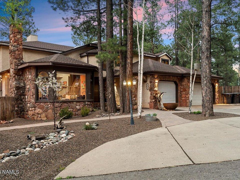 Here is your ICONIC FLAGSTAFF home - Historically, of the most DESIRABLE neighborhoods in town, tucked just above Coconino Estates near the FUTS, on almost an ACRE lot with huge VIEWS OF MOUNT ELDEN. Quick access to SKIING, TRAILS, DOWNTOWN & the COMMUNITY POOL. This multilevel home is filled with character & has something for everyone: 5 bedrooms, 4.5 baths, multiple living spaces, 2 person HOME OFFICE, gym, mudroom w/built-ins, main level GUEST SUITE, basement family/game room. Exterior includes mature trees, multiple places to entertain & enjoy our beautiful mountain town seasons including large wrap around decks w/views & jacuzzi, multiple professionally LANDSCAPED PATIOS with fire pits, play areas & beautiful large garden area. Almost brand NEW spacious CUSTOM kitchen with gorgeous cabinetry, QUARTZ COUNTERTOPS, custom open shelving & so much storage. BEAUTIFUL large primary suite has more ELDEN VIEWS from the private deck & views even in your SPA-LIKE custom shower. Lots of newer renovations include NEW WINDOWS throughout, home office remodel (great for WORK FROM HOME), flooring, basement addition, and custom primary closet build out. Flagstaff Urban Trail System is just at the bottom of the hill which takes you North to other trail systems or south to schools, parks and downtown. If you're worried about 180 traffic, there is an alternate route that avoids congestion & takes you out to Milton. Lower level could be turned into a guest suite with separate entrance or potential rental income.