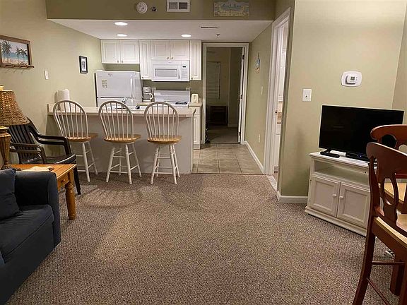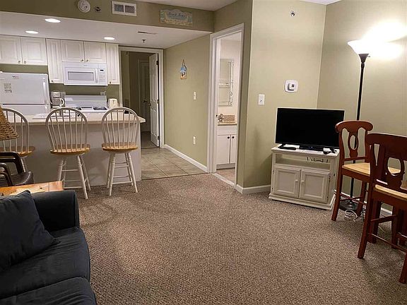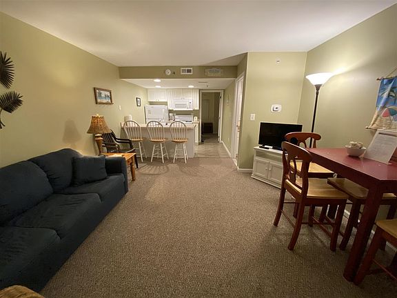 The Popular Surf Song is Just steps to the Beach!! 1 bedroom 1 bath, large living room, eat in kitchen with oversized island and 4 bar stools. The bedroom has 2 full sized beds, a dresser, and end table. Ceiling fan and large closet to finish it off. Tiled floors throughout. All furniture stays with the sale. Year round usage with central heating & AC, open floor plan, full kitchen including dishwasher and sold fully furnished! 2pools, 2 elevators, large patio area with BBQ grills right outside the condo with 4 grills. plus another large sun deck on the 5th floor with with beautiful ocean views. Enjoy the fireworks all summer on Friday nights! The condo fee includes ALL OF YOUR UTILITIES! (excluding cable).Great rental history and on site management if you decide to rent.